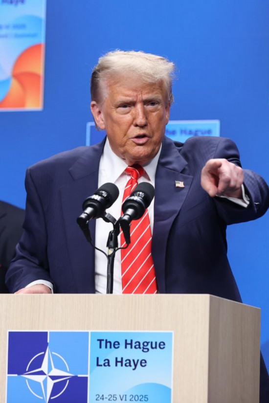 6月25日,在荷兰海牙,美国总统特朗普在北约峰会后出席记者会。新华社记者赵丁喆摄