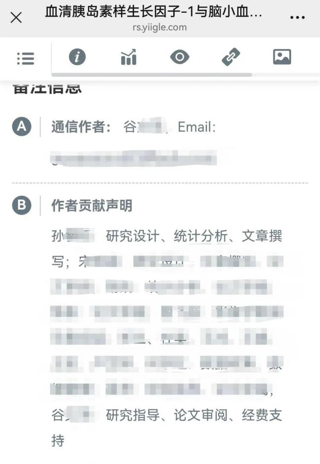 记者检索学术资料发现,孙同学曾以第一作者身份在《中华神经科杂志》发表题为《血清胰岛素样生长因子-1与脑小血管病患者颅内外动脉粥样硬化的相关性研究》的文章,其导师谷某某排名末尾。该文献发表于2025年8月8日,署名作者共14人,孙同学位列第一作者,谷某某为通讯作者,排在第14位。论文的第二作者、第三作者均为中南大学湘雅医院神经内科专家,且均持有医学博士学位。《中华神经科杂志》的页面显示,该论文的浏览量近1000次,下载量为154次。