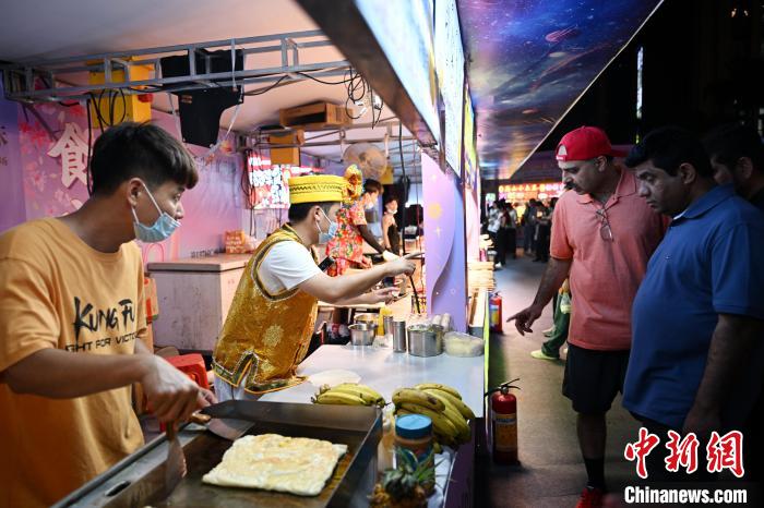 图为一煎饼摊位吸引游客。中新社记者 陈楚红 摄