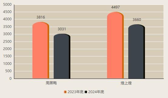 极速扩张后,这三家公司从2024年开始收缩版图。其中,煌上煌和周黑鸭在一年内关闭了七八百家门店。绝味食品的收缩步伐更大,门店总数从2023年底的15950家减少到2024年4月的12129家。