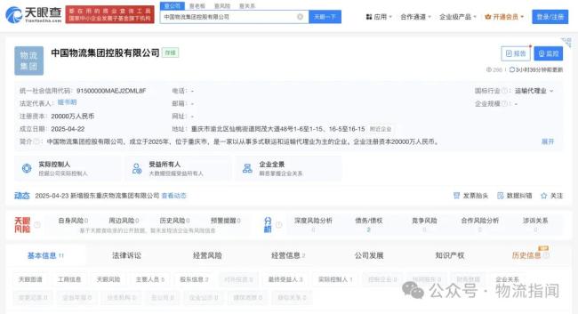 天眼查资料显示,4月22日,中国物流集团控股有限公司成立,法定代表人为姬书明,注册资本2亿元人民币,经营范围包括道路货物运输、保税仓库经营、保税物流中心经营等。股东信息显示,该公司由中国物流集团有限公司、重庆物流集团有限公司共同持股。