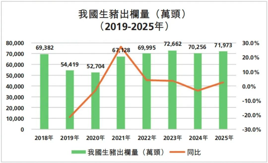 供给端来看,2021年后,国内生猪出栏数量整体提升。据国家统计局,2025年,全国生猪出栏71,973万头,较上年增长2.4%。