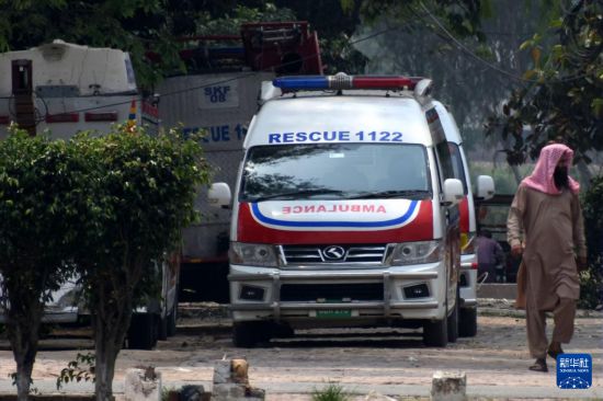 5月7日,救护车停在巴基斯坦东部旁遮普省谢赫布拉地区穆里德盖镇遭印度导弹破坏的建筑附近。新华社发(萨贾德摄)