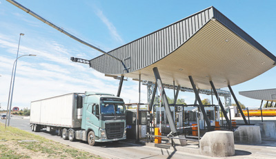 货车通过智利5号公路塔尔卡—奇廉段位于塔尔卡市的一处收费站。(人民日报拉美中心分社 路易斯·布兰科摄)