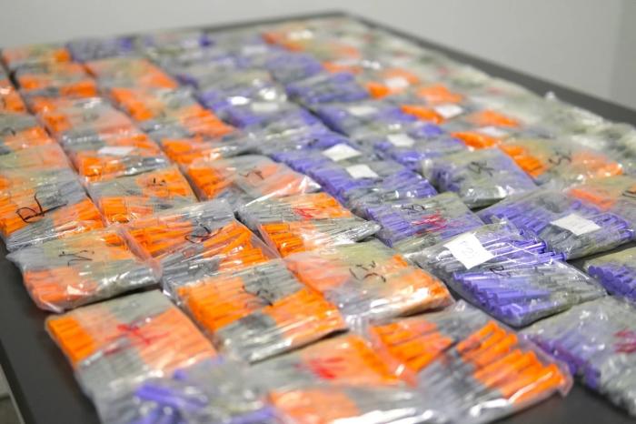 广州海关所属广州白云机场海关关员在对一架进境航班进行监管时,发现一名选择“无申报通道”进境的旅客步态僵硬、衣着臃肿。海关关员随即对其进行拦截,在该旅客腹部、背部、大腿及小腿等部位查获大量捆绑藏匿的减肥用注射针剂,共计1594支。经询问,该旅客自述为收取带工费而携带针剂。