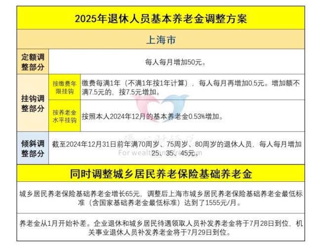 公布的养老金调整方案通常会在7月31日前将调整补发的差额发放到退休老人手中。今年总体养老金调整水平为2%,这是根据上年度全国社会平均工资增长情况、物价增长情况以及养老保险基金的长期负担能力综合确定的。个人具体增加的养老金金额则依据各省份的具体情况而定。