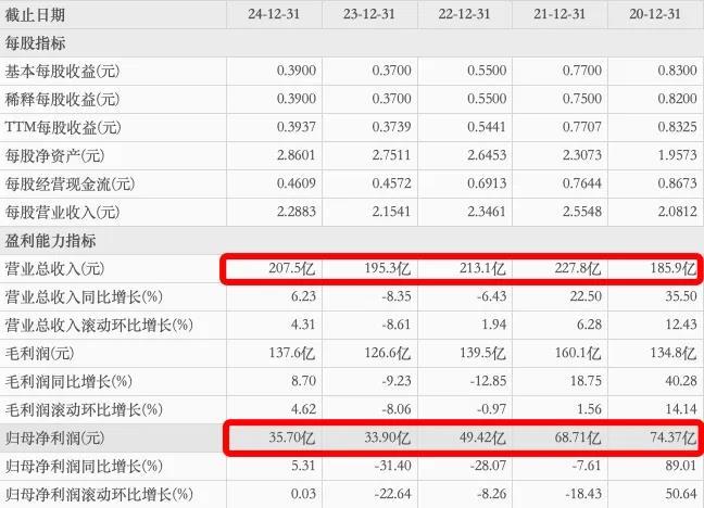 体现在中国飞鹤的业绩层面,2020年至2024年,中国飞鹤营收分别为185.9亿元、227.8亿元、213.1亿元、195.3亿元和207.5亿元;净利润表现却截然不同,分别为74.37亿元、68.71亿元、49.42亿元、33.9亿元和35.7亿元。虽然营收变动幅度不大,但净利润已较巅峰时呈现“腰斩”局势。