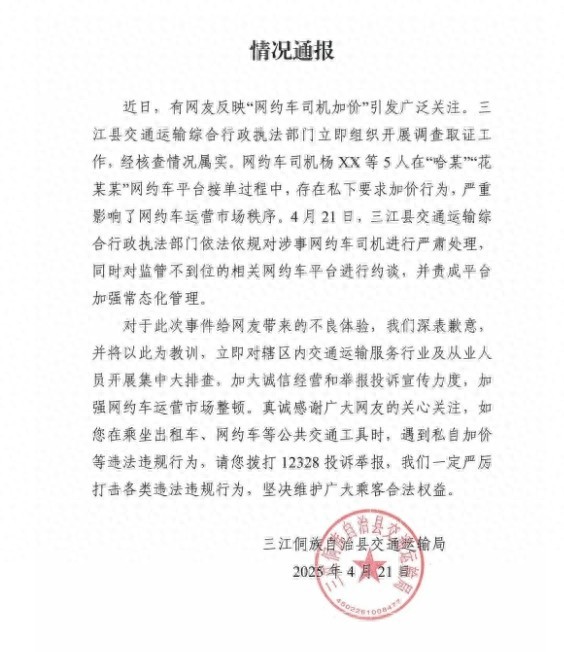 近日,有网友反映广西三江侗族自治县出现网约车司机加价的情况,引起了广泛关注。三江县交通运输综合行政执法部门迅速介入调查,确认情况属实。